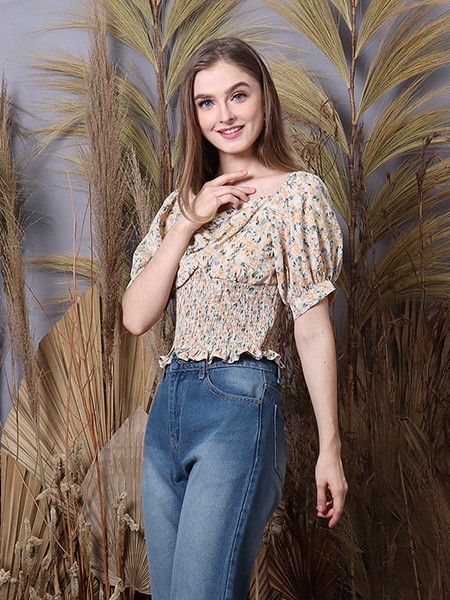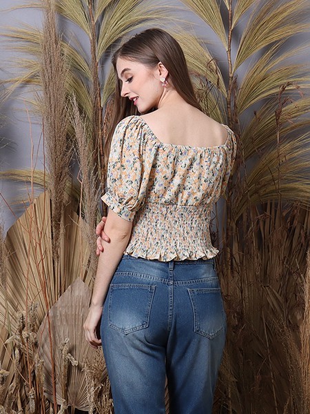 Flower Embroidered Waist Drawstring Top Flower Embroidered Waist Drawstring Top