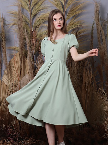 Cottage Core Square Neck Puff Sleeves Midi Dress