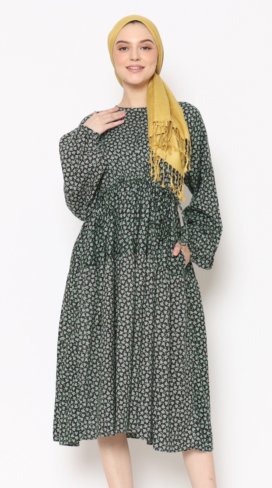 The product material is made from Polyester. Washing instruction: Hand or machine wash. Use lukewarm water. Use a gentle cycle if using a washing machine. Model wears J.Rep Petite size (Small).