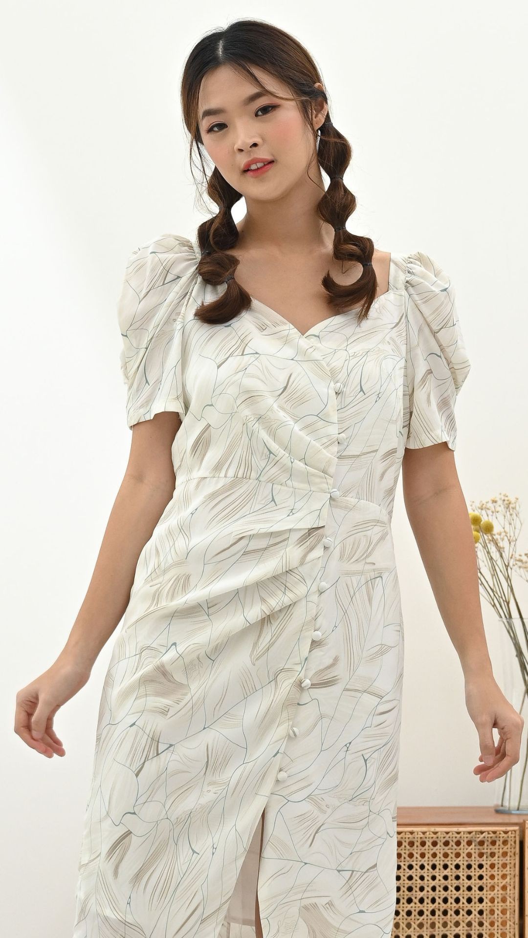 The product material is made from Polyester. Washing instruction: Hand or machine wash. Use lukewarm water. Use a gentle cycle if using a washing machine. Model wears J.Rep Petite size (Small).